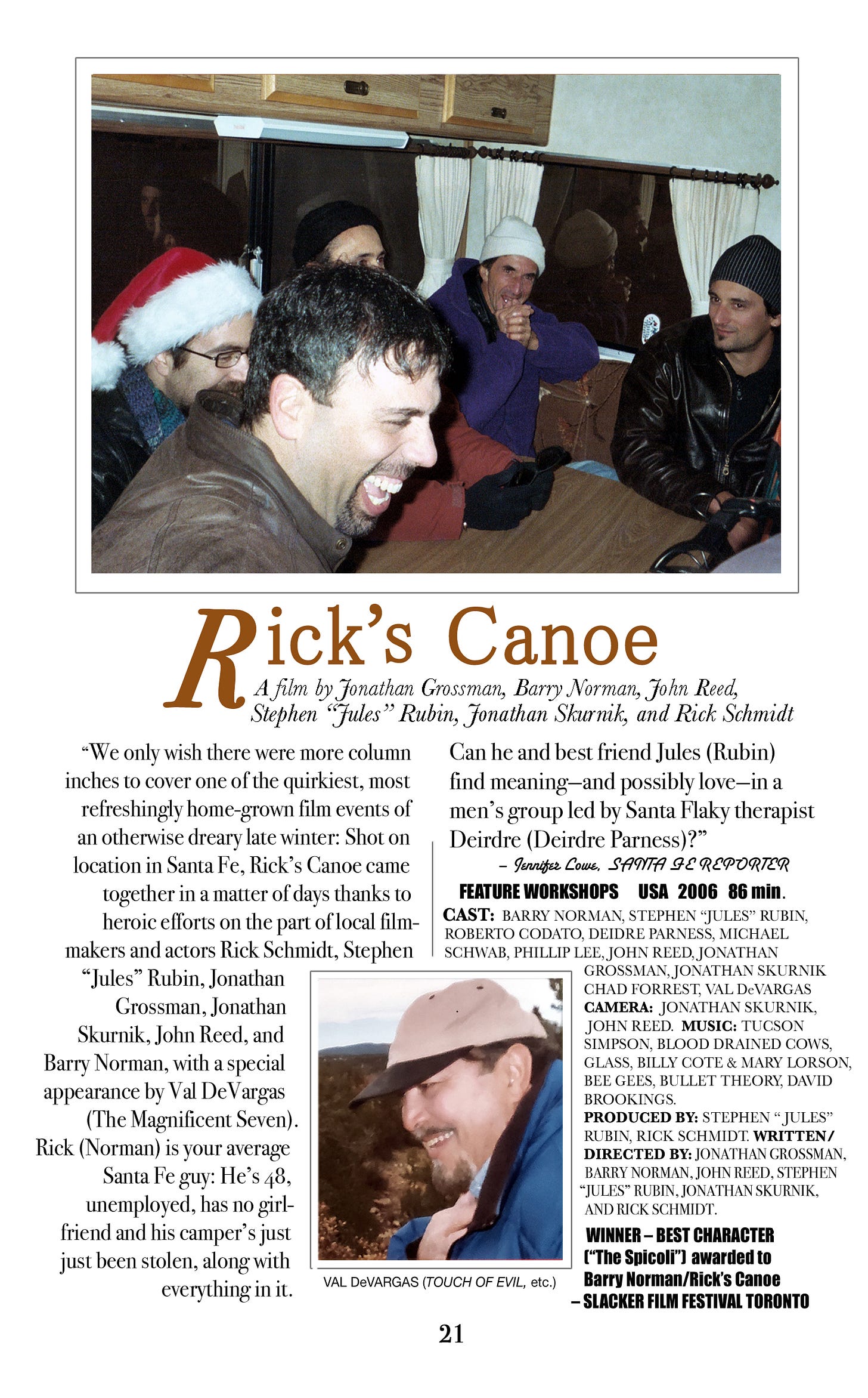 “We only wish there were more column inches to cover one of the quirkiest, most refreshing homegrown film events of an otherwise dreary late summer. Rick's Canoe came together in a matter of days thanks to heroic efforts on the part of local filmmakers and actors Rick Schmidt, Stephen "Jules" Rubin, Jonathan Grossman, Jonathan Skurnik, John Reed, and Barry Norman, with special appearance by Val DeVargas (The Magnificent Seven). Rick (Norman) is your average Santa Fe guy: He's 48, unemployed, has no girlfriend and his camper's just been stolen, along with everything in it. Can he and his best friend Jules (Rubin) find meaning – and possibly love – in a men's group led by Santa Flaky therapist Dierdre (Dierdre Parness)?