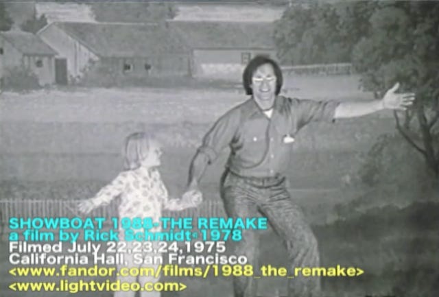 The second film of my trilogy, SHOWBOAT 1988—THE REMAKE (91 1/2 minutes, B&W/Color, ©1978 L.L. Productions) (A MAN, A WOMAN, AND A KILLER and EMERALD CITIES complete my three features about ‘The American Dream’), is about a huge audition for the remake of the classic American musical "Showboat." For three nights, July 22-24, 1975, hundreds of San Francisco’s most bizarre talent turned up, while actor ED NYLUND, a real-life librarian and musicologist, tried to enact his dream of bringing "the stench of death" to the musical comedy form. As he narrates real-life stories of his childhood failures, the viewer can better understand an auditioner’s leap for glory.