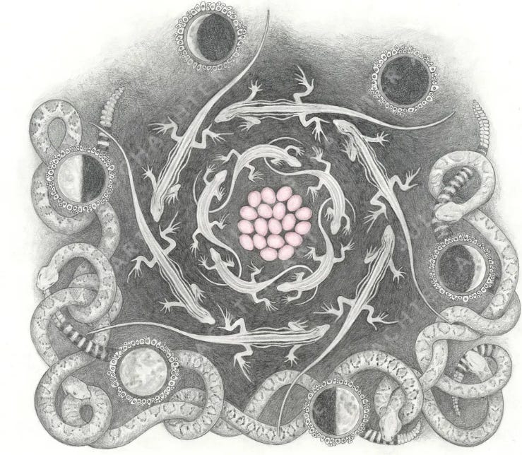 Soon after moving to northern New Mexico, I became acquainted with the whiptail lizard. These little darting reptiles (New Mexico's official state reptile) are ubiquitous around my home and garden - and all of them are females. The whiptail reproduces parthenogenetically, and this process of cloning itself is possibly facilitated by "going through the motions" with another female. While the whiptails in this drawing are protectively circling their female progeny to be, the oblivious (male) rattlesnakes - a lizard predator - are too busy attacking each other and themselves to notice. The circles containing the moon phases also mimic the human egg cell.