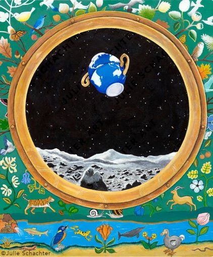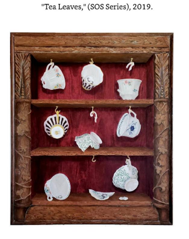 “The "Misaligned World '' artwork is another example of Schachter's wizardry. Concept, design and mastery of the craft brings the viewer to ponder the icons of animal life left behind, as man-made teacups drift off into the unknown taking the earth with them. The painting becomes a commentary on the human condition and how unaware we are of the magnificence of the physical world which we have inherited and how willing we are to let it disappear. Bravo!