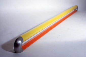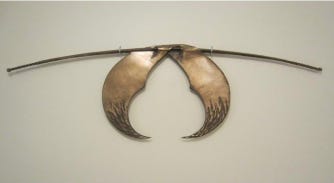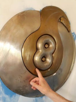 After a few weeks, I converted a vacant children’s playhouse in my back yard into a usable art studio (it accommodated a six-foot-high person with its peaked roof and 7’ square interior, and already had handy waist-high wraparound counters), and started playing with an old, half-circle wooden mold that I had purchased at a recent garage sale. I filled it with hot molten wax and let the material cool and coagulate to about a 3/16" thickness, creating some half-tube shapes. Then connecting them by melting the surfaces together, I made two identical undulating forms, wiggly like a snake, that I thought could be poured as aluminum. I figured that I could connect the two metal pieces to similar sized half-round wooden sticks, two inches in diameter. I could then finish those surfaces with spray paint, to create some sort of trapezoidal wall-hanging or floor piece.